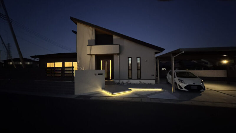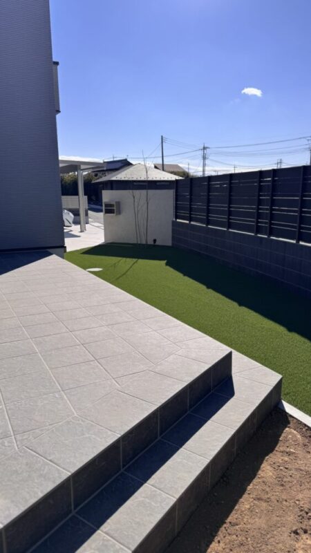 高崎市A様邸の外構工事。今回の主役はやはりアプローチでしょうか?動線を意識した2色使いの平板に、照明を忍ばせた変則型のフローティングステップ、そして左官仕上げの門袖など、こだわりだらけです。お庭に造ったタイルテラスも使い勝手を考えて台形型になっており、テラスから直接菜園スペースに水くれなどできるようになっています。